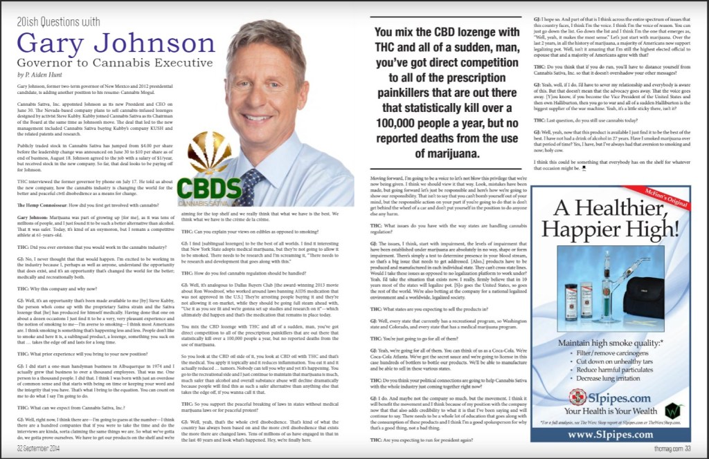 Cannabis Sativa, Inc. appointed Johnson as its new President and CEO on June 30. The Nevada-based company plans to sell cannabis-infused lozenges designed by activist Steve Kubby. Kubby joined Cannabis Sativa as its Chairman of the Board at the same time as Johnson’s move. The deal that led to the new management included Cannabis Sativa buying Kubby’s company KUSH and the related patents and research.